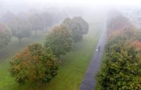 A man drives his scooter through a park in Frankfurt, Germany, on a foggy Thursday, Oct. 19, 2023. (AP Photo/Michael Probst)