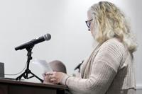 Margaret Pachulis, who was injured marching with a group with the Catholic Community of Waukesha, reads a statement during Darrell Brooks' sentencing in a Waukesha County Circuit Court in Waukesha, Wis., on Tuesday, Nov. 15, 2022. Dozens of people are expected to speak at the sentencing proceedings for Brooks, who is convicted of killing six people and injuring dozens more when he drove his SUV through a Christmas parade in Waukesha last year. (Mike De Sisti/Milwaukee Journal-Sentinel via AP, Pool)