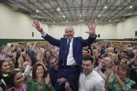 Fianna Fail leader Micheal Martin is hoisted up by his sons Cillian and Micheal Aodh, after he was deemed elected in the Cork South Central constituency at the election count centre at Nemo Rangers GAA Club in Cork, after the General Election, Saturday Nov. 30, 2024. (Jacob King/PA via AP)