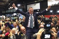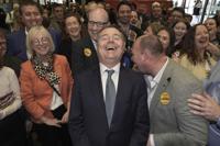 Fine Gael politician Paschal Donohoe celebrates with supporters at RDS, the Royal Dublin Society, after voters went to the polls during Ireland's election in Dublin, Sunday, Dec. 1, 2024.(AP Photo/Peter Morrison)