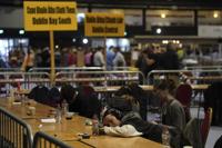 People take a break as the election count continues at RDS Simmonscourt after voters went to the polls during Ireland's election, in Dublin, Sunday, Dec. 1, 2024. (Brian Lawless/PA via AP)