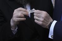 The US ambassador to Israel Mike Huckabee holds a note given to him from US President Donald Trump to be placed in the cracks of the Western Wall, the holiest site where Jews can pray, in the Old City of Jerusalem, Friday, April 18, 2025. (AP Photo/Leo Correa)