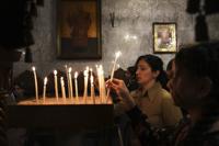 Palestinian Christians light candles during Good Friday mass at the Greek Orthodox Church of Saint Porphyrius in Gaza City, Friday, April 18, 2025. (AP Photo/Jehad Alshrafi)