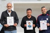 FILE - Iran's coach Amir Ghalenoei, center, and Iran's Football Federation Vice President Mehdi Mohammad Nabi, left, hold pictures of children allegedly killed in a U.S. and Israel strikes in Iran, before an international friendly soccer match between Iran and Costa Rica, in Antalya, southern Turkey, Tuesday, March 31, 2026. (AP Photo/Riza Ozel, File)