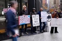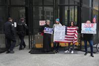 People hold signs as they wait for U.S. Customs and Border Patrol Gregory Bovino outside federal court in Chicago, Tuesday, Oct. 28, 2025. (AP Photo/Nam Y. Huh)