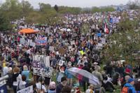 Demonstrators hold up signs during a "Hands Off!" protest against President Donald Trump at the Washington Monument in Washington, Saturday, April 5, 2025. (AP Photo/Jose Luis Magana)