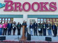 New Mexico Gov. Michelle Lujan Grisham, center, announces the state will provide $30 million in emergency food assistance to residents to temporarily backfill SNAP benefits during a news conference outside a grocery store in Albuquerque, New Mexico, on Wednesday, Oct. 29, 2025. (AP Photo/Susan Montoya Bryan)