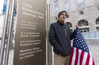Taylor Williamson, who works for a company doing contract work for the United States Agency for International Development, or USAID, holds an American flag as he stands outside the USAID headquarters in Washington, Monday, Feb. 10, 2025. (AP Photo/Manuel Balce Ceneta)