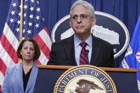 FILE - Attorney General Merrick Garland speaks at the Department of Justice in Washington, Thursday, April 13, 2023. Deputy Attorney General Lisa Monaco stands at left. (AP Photo/Evan Vucci, File)