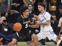 Colorado guard RJ Smith, left, looks to pass the ball as Kansas guard Zeke Mayo, right, defends in the first half of an NCAA college basketball game Monday, Feb. 24, 2025, in Boulder, Colo. (AP Photo/David Zalubowski)