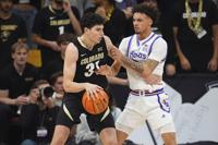 Colorado guard Harrison Carrington, left, drives to the basket as Kansas guard Zeke Mayo, right, defends in the first half of an NCAA college basketball game Monday, Feb. 24, 2025, in Boulder, Colo. (AP Photo/David Zalubowski)
