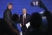 Russian President Vladimir Putin, center, leaves a meeting with foreign policy experts at the Valdai Discussion Club in the Black Sea resort of Sochi, Russia, early Friday, Nov. 8, 2024. (Maxim Shipenkov/Pool Photo via AP)