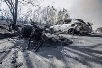 The burned wreckage of a motorcycle and cars that were damaged by wildfires on the slopes of Table Mountain in Cape Town, South Africa, Monday, April 28, 2025. (AP Photo/Str)