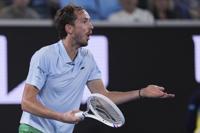 Daniil Medvedev of Russia reacts during his second round match against Learner Tien of the U.S. at the Australian Open tennis championship in Melbourne, Australia, Thursday, Jan. 16, 2025. (AP Photo/Ng Han Guan)