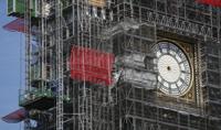FILE - Scaffolding surrounds the hand-less face of the world famous clock on the Queen Elizabeth Tower, which also holds the bell known as Big Ben, as it continues to be refurbished as part of the overall 3.5 billion pound repair of the Palace of Westminster, in London, Tuesday, April 17, 2018. (AP Photo/Alastair Grant, File)