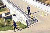 In this surveillance camera image released by the Council Bluffs, Iowa, Police Department, former U.S. Sen. Martha McSally, left, of Arizona, looks back at a man while she was jogging at Tom Hanafan River’s Edge Park, Wednesday, Nov. 8, 2023, in Council Bluffs, Iowa. A man was arrested early Friday, Nov. 10, in the alleged assault of McSally, who says she was molested as she jogged along the Missouri River in Council Bluffs. (Council Bluffs Police Department via AP)