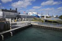 Manatees gather near the warm-water outflows of a Florida Power & Light Company power plant in Riviera Beach, Fla., where the company operates the free Manatee Lagoon attraction, Friday, Jan. 10, 2025. (AP Photo/Rebecca Blackwell)