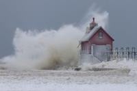 A large wave from Lake Michigan sends ice balls into the air as it crashes into the South Pierhead Outer Light at Grand Haven State Park in Grand Haven, Mich., Monday, Jan. 19, 2026. (Joel Bissell/Kalamazoo Gazette via AP)