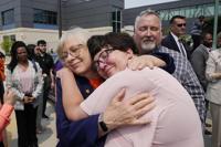 Karen Kobylik, foreground is hugged after Michigan Gov. Gretchen Whitmer signed legislation, Monday, May 22, 2023, in Royal Oak, Mich., to create extreme risk protection orders, which authorize family, police officers, or medical professionals to seek a court order to temporarily keep guns out of the hands of someone who represents a danger to themselves or others. Karen's daughter Ruby Taverner shot and killed her boyfriend and her brother Bishop Taverner before taking her own life hours later on May 8, 2022. (AP Photo/Carlos Osorio)