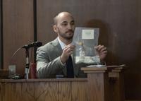 Deputy Alec Preadmore of traffic services for the Monroe County Sheriff's Department, holds evidence during the trial of Marshella Chidester at the Monroe County Courthouse, Thursday, March 6, 2025, in Monroe, Mich. (Mandi Wright/Detroit Free Press via AP, Pool)