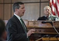 Assistant Monroe County Prosecutor Kenneth Lauren makes closing arguments during the trial for Marshella Chidester at the Monroe County Courthouse, Thursday, March 6, 2025, in Monroe, Mich. (Mandi Wright/Detroit Free Press via AP, Pool)