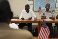 Hundreds of refugee families were resettled by The Catherine McAuley Center, founded by the Catholic Sisters of Mercy, until the nationwide this spring. At a recent class offered by the center, a Guatemalan woman and her son, along with five men from China, Benin, Togo, Sudan and Congo, sang the U.S. national anthem and rehearsed questions for the .