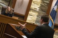Minnesota Supreme Court Associate Justice Theodora Karin Gaïtas, left, listens as Nicholas Nelson, an attorney representing Republican House leadership, responds to her question during oral arguments at the Minnesota Judicial Center in St. Paul, Minn., Thursday, Jan. 23, 2025. (Ben Hovland/Minnesota Public Radio via AP, Pool)