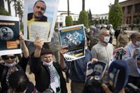 FILE - People carry banners and chant slogans during a protest calling for the release of detained journalists Omar Radi and Soulaimane Raissouni, in downtown Rabat, Morocco, Tuesday, May 25, 2021. Morocco’s King Mohammed VI on Monday, July 29, 2024, pardoned three journalists, including Radi and Raissouni, who were charged with sex crimes and espionage in prosecutions widely condemned by press freedom advocates as retaliatory in response to critical reporting. (AP Photo/Mosa'ab Elshamy, File)