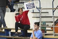 A spectator holds up a Protect Women's Sports sign during the third set of an NCAA college volleyball match between the San Jose State Spartans and the Air Force Falcons Thursday, Oct. 31, 2024, in San Jose, Calif. (AP Photo/Eakin Howard)