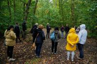 Wolfgang Bivour 75, center, a mushroom hunting tour leader, instructs mushroom pickers on how to hunt mushrooms in a forest in Potsdam, Germany, Wednesday, Oct. 8, 2025. (AP Photo/Ebrahim Noroozi)