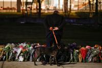A man walks a dog close to a memorial near Brown University's Barus and Holley building in Providence, R.I., Wednesday, Dec. 17, 2025. (Lily Speredelozzi/The Sun Chronicle via AP)