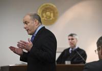 Defense attorney Arthur Frost, left, delivers closing arguments in Kevin Monahan murder trial, Tuesday, Jan. 23, 2024, at the Washington County Courthouse in Fort Edward, N.Y. Monahan, 66, is charged with second-degree murder in the death of Kaylin Gillis, who was riding in a caravan of two cars and a motorcycle that pulled into his dark, winding driveway in rural Hebron, about 40 miles (65 kilometers) north of Albany, near the Vermont border. (Will Waldron/The Albany Times Union via AP, Pool)