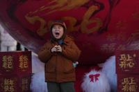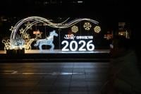 A child poses for a photo with a prosperity decoration to welcome 2026 Year of the Horse, following the Chinese zodiac at a shopping district on new year's eve, in Beijing, Wednesday, Dec. 31, 2025. (AP Photo/Andy Wong)