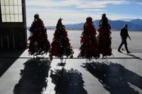 Christmas trees are displayed inside a hangar at Peterson Space Force Base in Colorado Springs, Colo., on Thursday, Dec. 18, 2025 in advance of the annual NORAD Tracks Santa Operation, at the North American Aerospace Defense Command. (AP Photo/Thomas Peipert)