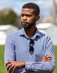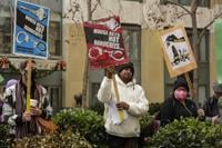 CORRECTS SOURCE TO NEWS&RECORD = N.C. State Representative Cecil Brockman gets a look at the inside of a pallet house at Pomona Park in Greensboro, N.C., on Monday, March 13, 2023. (Woody Marshall/News & Record via AP)
