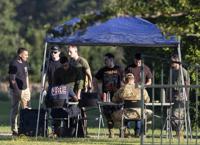 Local law enforcement and airmen from Joint Base Charleston set up a tent and tables to begin coordinating recovery efforts for a stealth fighter jet that crashed in Williamsburg County, S.C., on Monday, Sept. 18, 2023. (Henry Taylor/The Post And Courier via AP)