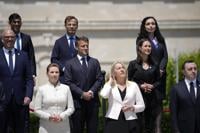Participants of the 2nd European Conference on Border Management pose for a group photo, in Vouliagmeni suburb, southeast of Athens, Greece, Friday, Feb. 24, 2023. Speaking on the anniversary of the Russian invasion of Ukraine, European Union officials and representatives of countries bordering Ukraine said they were prepared to cope with an additional number of refugees from the war-torn country if needed. (AP Photo/Michael Varaklas)