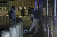 Israeli police examine the scene of an alleged stabbing attack at Shuafat crossing in east Jerusalem, Monday, Feb. 13, 2023. Israeli police said a Palestinian attacker pulled out a knife during an inspection at a military checkpoint, and officers opened fire. Police said the attacker was arrested and an officer was critically wounded in the incident. (AP Photo/Mahmoud Illean)