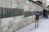 A man looks at Paris' Shoah Memorial defaced with green paint after several Jewish sites across the capital were defaced with green paint. Saturday, May 31, 2025 in Paris. (AP Photo/Aurelien Morissard)