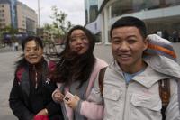 Visitors to the Wangfujing shopping street reacts to strong winds as gale force alerts cancelled flights and close some public venues in Beijing, China, Saturday, April 12, 2025. (AP Photo/Ng Han Guan)