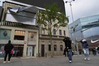 Shoppers react near a large advertisement which is blown loose at the Wangfujing shopping street as gale wind alerts cancelled flights and close some public venues in Beijing, China, Saturday, April 12, 2025. (AP Photo/Ng Han Guan)