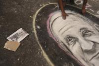 A street artist chalks a portrait of the late Pope Francis in front of the Cathedral in Buenos Aires, Argentina, Monday, April 21, 2025. (AP Photo/Gustavo Garello)