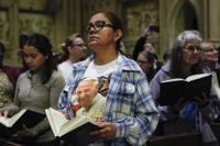 Parishioners pray during a mass for Pope Francis at St. Patrick's Cathedral, Tuesday, April 22, 2025, in New York. (AP Photo/Julia Demaree Nikhinson)