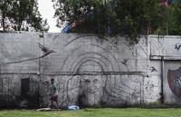 FILE - A man walks past a mural of Pope Francis at the stadium of San Lorenzo, his soccer team, in the Padre Ricciardelli neighborhood of Buenos Aires, Argentina, Feb. 25, 2025. (AP Photo/Rodrigo Abd, File)