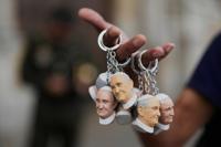 A street vendor sells key chains of the late Pope Francis outside the Cathedral in Bogota, Colombia, Wednesday, April 23, 2025. (AP Photo/Fernando Vergara)