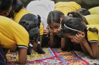School students and teachers participate in a mock drill trained by civil defence members to respond in case of attack in Guwahati, India, Saturday, May 10, 2025 amid rising fears of wider conflict following India's strikes in Pakistan. (AP Photo/Anupam Nath)