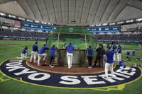 Players of Los Angeles Dodgers warm up during a training session in Tokyo, Friday, March 14, 2025, ahead of the Dodgers to play their MLB opening games against the Chicago Cubs at the Tokyo Dome next week. (AP Photo/Eugene Hoshiko)
