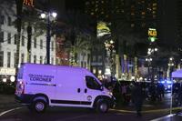 A coroner's van leaves the scene after a vehicle drove into a crowd on New Orleans' Canal and Bourbon streets, Wednesday, Jan. 1, 2025. (AP Photo/George Walker IV)