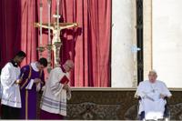 Pope Francis arrives on a wheelchair at the end of a mass in St. Peter's Square at The Vatican, Sunday, April 6, 2025, part of the jubilee of the sick and the health workers. (AP Photo/Andrew Medichini)
