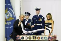 President Donald Trump, left, holds a sabre after using it to cut a cake as first lady Melania Trump, right, watches at the Commander in Chief Ball, Monday, Jan. 20, 2025, in Washington. (AP Photo/Alex Brandon)
